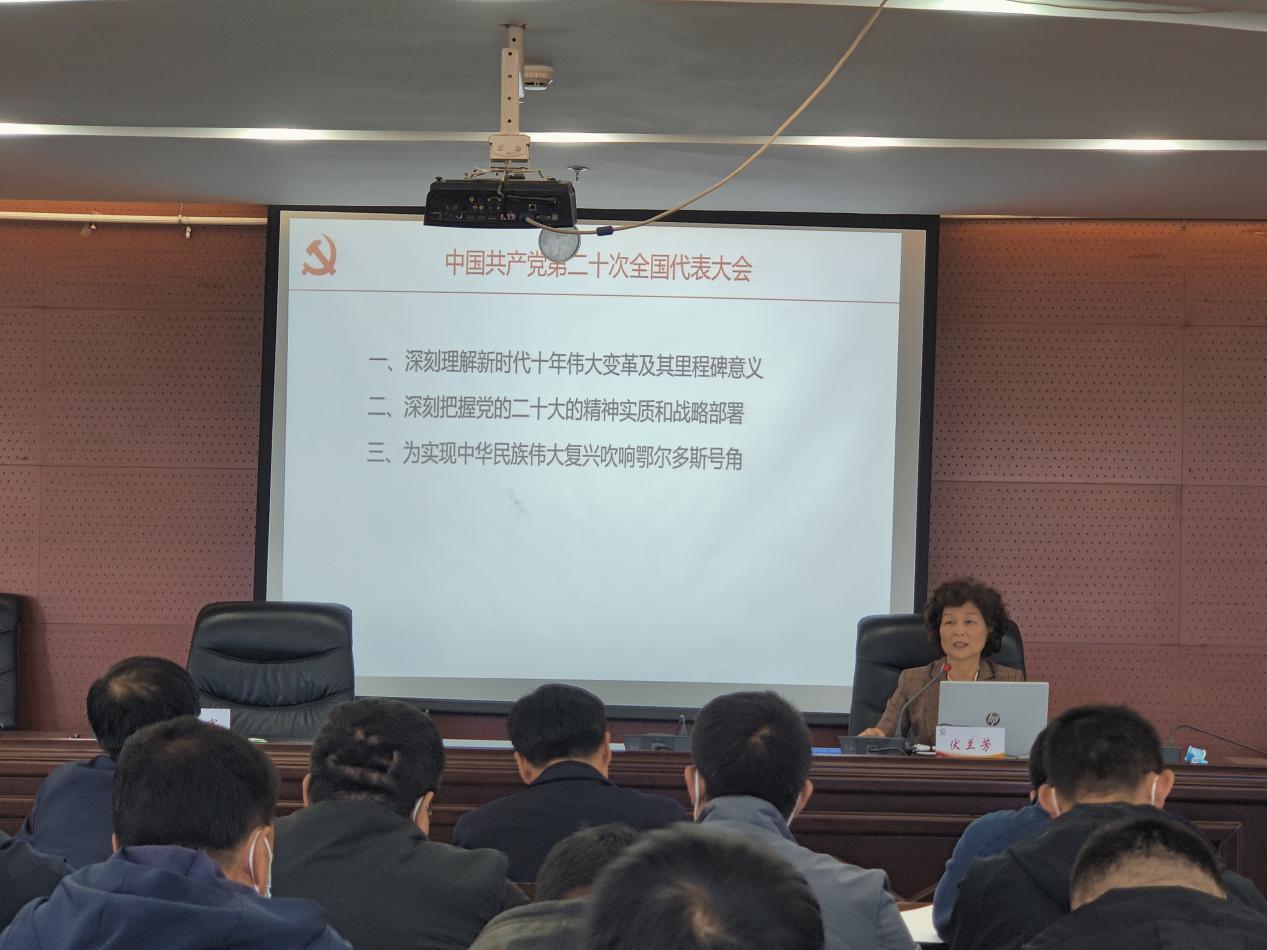 学习会邀请学习贯彻党的二十大精神365bet网上娱乐场_365双试投注是什么_365bet正网开户宣讲团成员、市直机关党工委伏兰芳书记作党的二十大精神宣讲辅导。伏兰芳书记以“为实现中华民族伟大复兴而团结奋斗——学习贯彻中国共产党第二十次全国代表大会精神”为主题,从深刻理解过去五年的工作和新时代十年的伟大变革、深刻把握党的二十大的精神实质和战略部署、为实现中华民族伟大复兴吹响鄂尔多斯号角3个方面对党的二十大精神作了深入浅出、全面系统的解读。